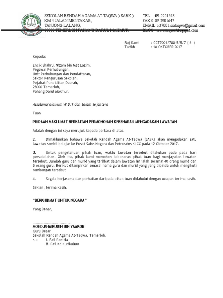 Contoh surat makluman ke ppd contoh surat. Surat memohon kebenaran mengadakan program via www.scribd.com. Surat kebenaran lawatan ke kumpulan via. *potong mana yang tidak berkenaan. Smk raja abdullah jalan kepong 52000 kuala lumpur. Pengurus kilang roti dan biskut, 8a, jalan 6, 42800… karangan surat rasmi lawatan sambil belajar :